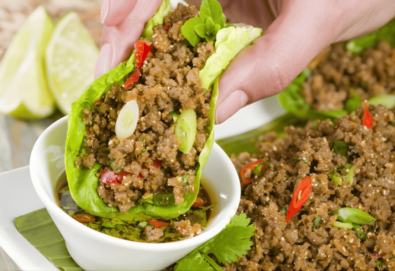 This is a nom dish made from minced meat and accompanying herbs. Minced Meat Salad is considered the national dish of Laos. The main ingredients to make this dish are usually beef, chicken, duck or pork along with some traditional spices such as ground rice, fish sauce, lemon juice and fresh herbs. Besides, this salad is often eaten with raw vegetables and sticky rice to increase the taste of the dish, helping us not easily get bored and bloated.