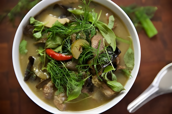 Or Lam is a dish with stewed meat and accompanying vegetables and has a quite spicy flavor. This dish originates from the ancient capital of Luang Prabang – Laos. The ingredients to make this dish are mainly eggplant, chili, tofu, lemongrass, wild mushrooms, basil, herbs and Mai Sakaan – the plant that gives the dish its spicy taste.